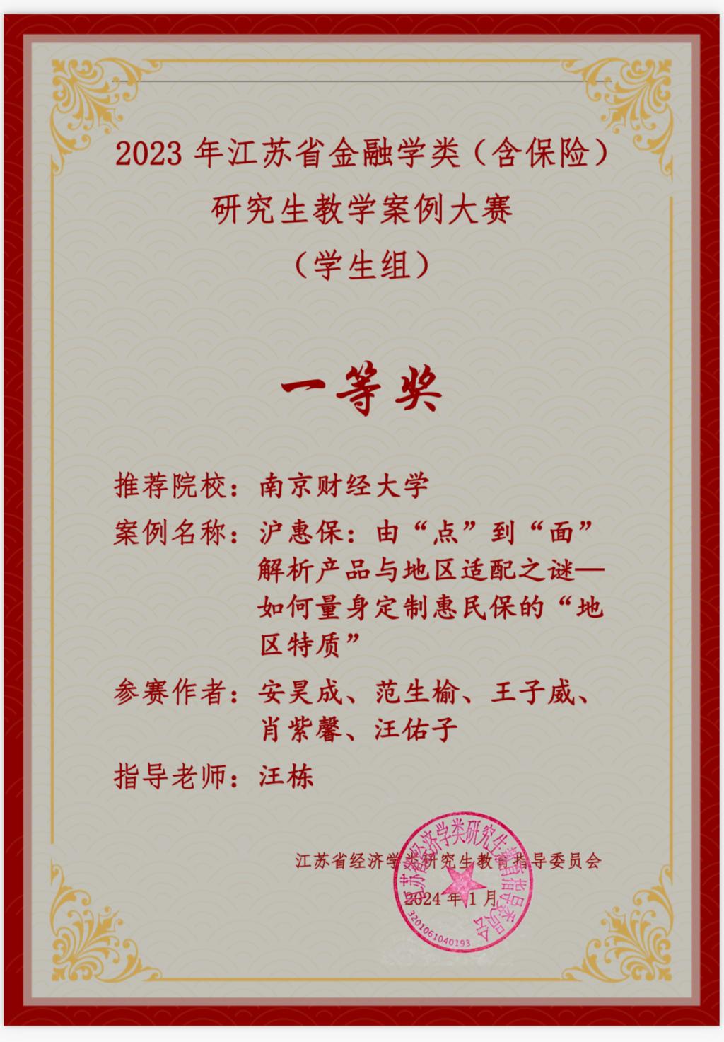 3月12日,由江苏省经济学类研究生教指委主办的江苏省金融学类(含保险)研究生案例大赛公布结果,吃瓜视频 21级应用经济学研究生王子威、23级公共管理学研究生肖紫馨、安昊成的保险类分析作品《沪惠保:由“点”到“面”解析产品与地区适配之谜——如何量身定制惠民保的“地区特质”》荣获江苏省一等奖。