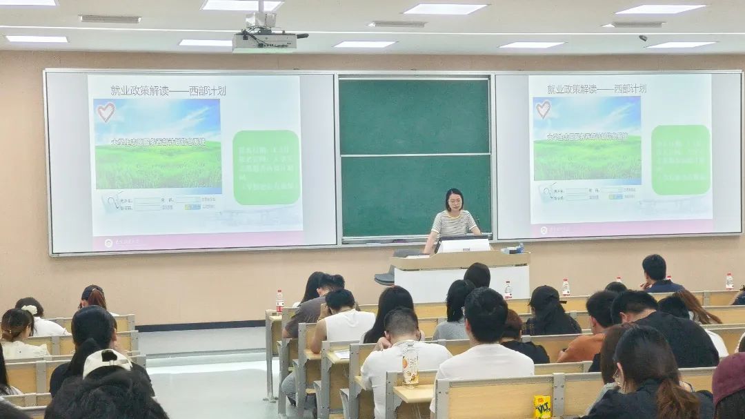 随后,2021级辅导员李小燕老师进行了“就业政策解读”。她详细解读了“苏北计划”、“西部计划”、“三支一扶”等多项政策,为同学们未来的发展方向提供了多种选择、多条指引。