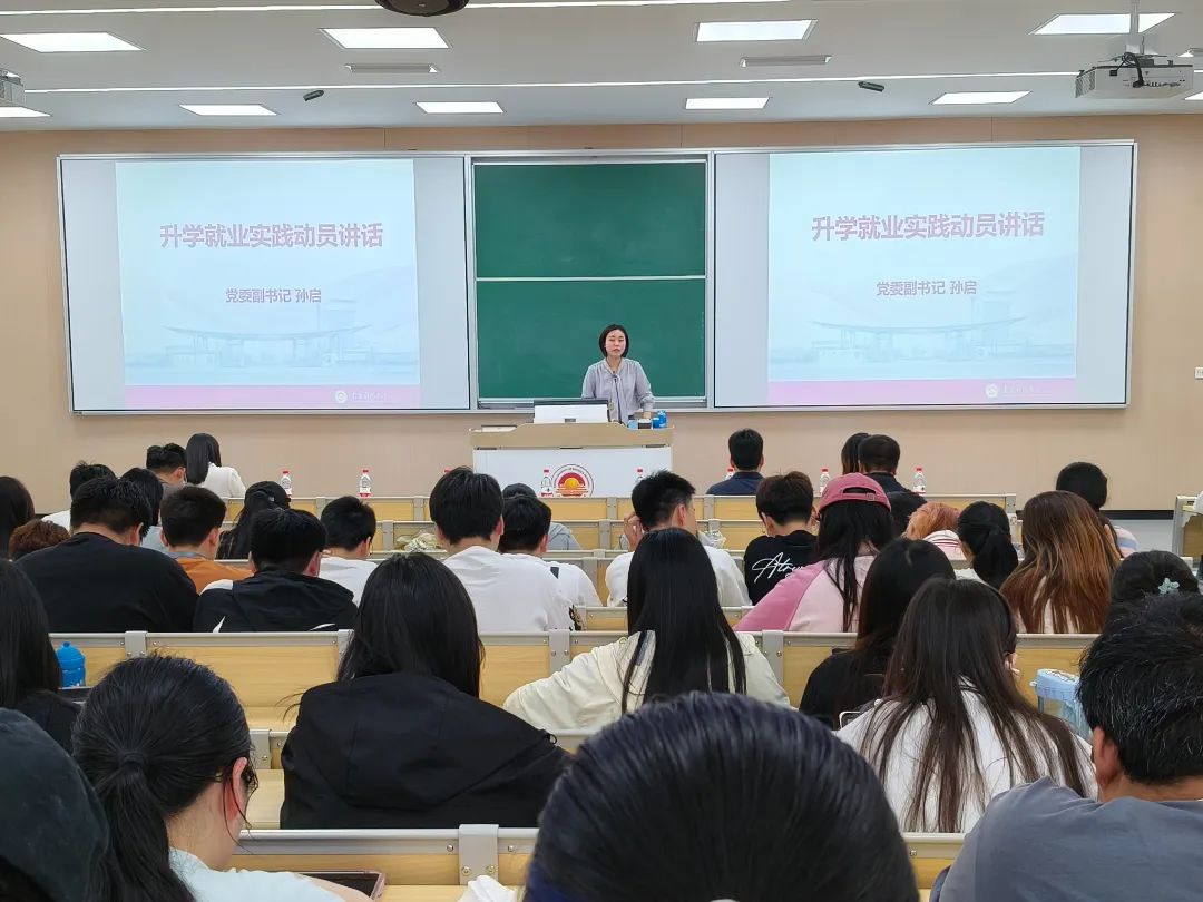 就业分享暨暑期社会实践动员大会在博观楼202举行,党委副书记孙启、专业教师靳亮、2021级辅导员李小燕、2022级辅导员于华及2021级、2022级全体本科生共同参加此次大会。