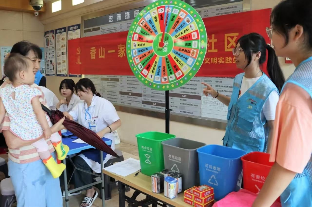 互动体验区成为活动“人气王”。社区定制的垃圾分类知识转盘,盘面标注“过期药品”“废旧电池”“剩菜剩饭”等各类垃圾,居民转动转盘后,需准确说出对应垃圾的投放类别。一位阿姨转动转盘指向“废水银温度计”,稍作思考后回答:“属于有害垃圾!”随后将模拟垃圾卡片投入对应分类桶,成功获得小礼品。这种“游戏化+知识科普”的模式,让居民在趣味互动中深化环保认知。