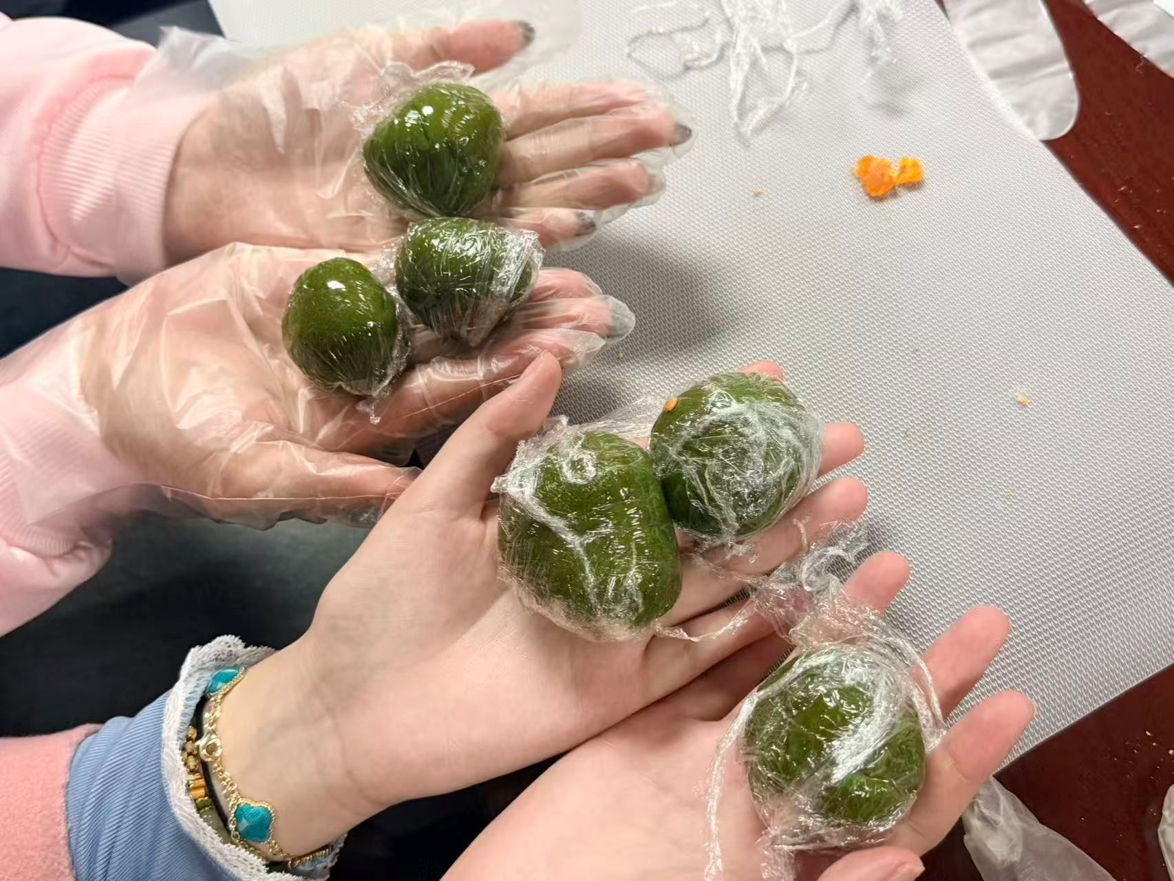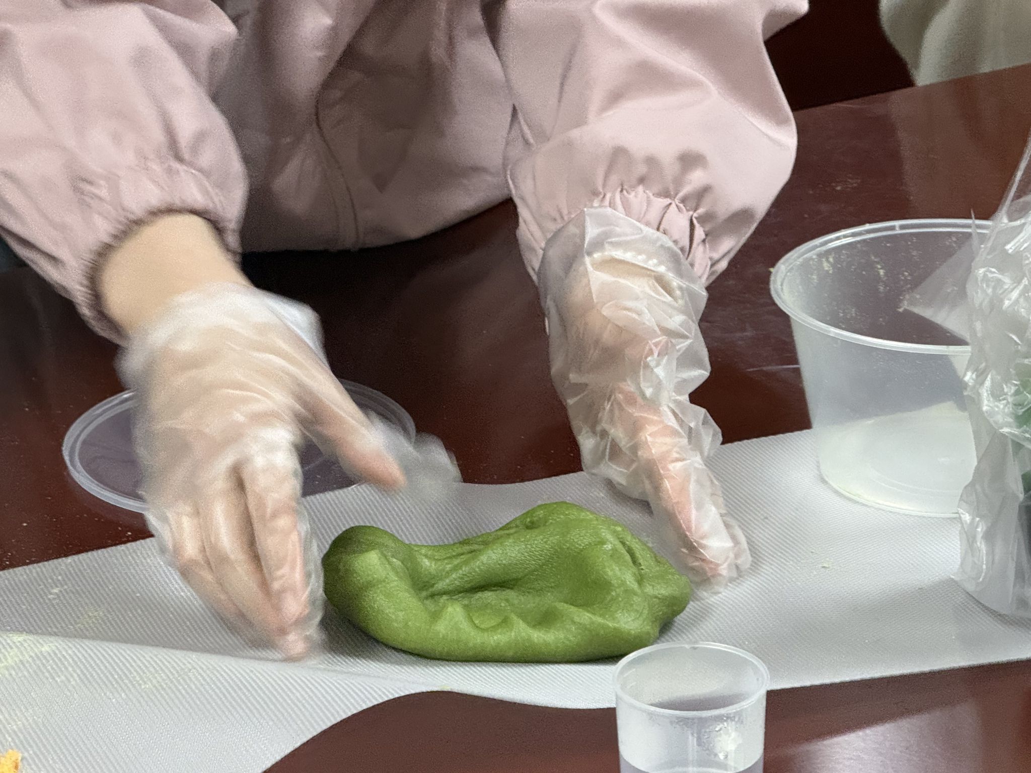 简短的讲解过后,重头戏正式开场。桌案上,青团粉、红豆馅、咸蛋黄、肉松整齐排列,等待着变成新的组合。同学们纷纷戴上手套,挽起袖口,平日里握笔的手此刻与面团亲密接触。揉、搓、捏、包,动作虽显生涩,专注却格外动人。