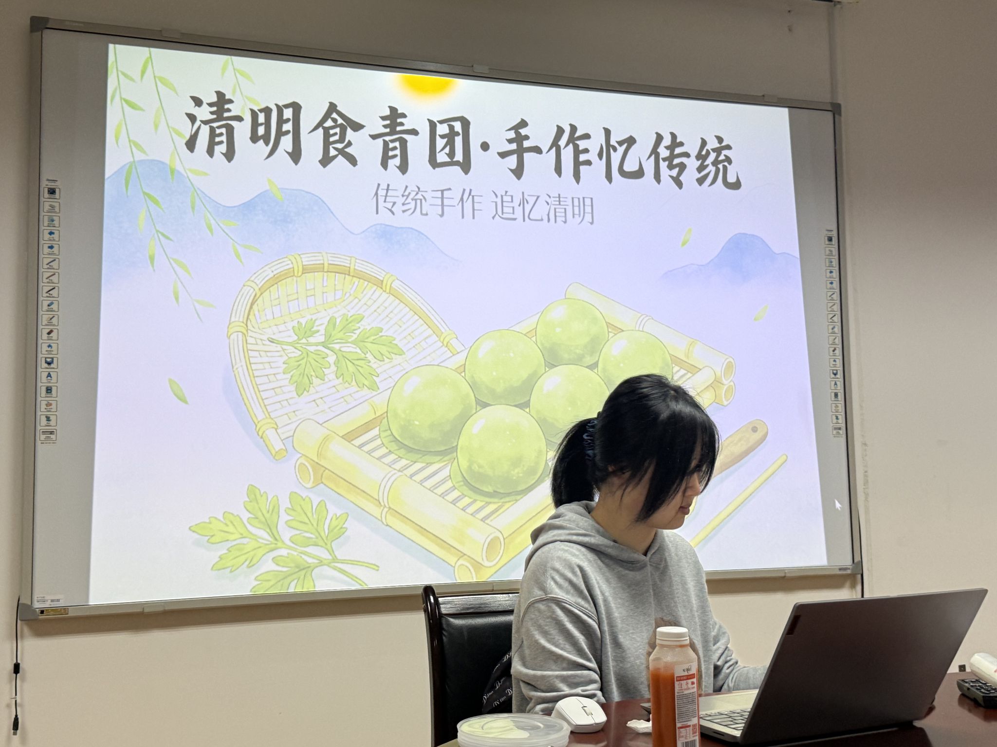 “清明时节,古人取艾草汁染糯成团,既是祭祖的敬意,也是迎春的仪式。”主持人以一连串提问拉开序幕,同学们纷纷举手抢答。在一问一答之间,青团的前世今生、清明时节的民俗故事被一一揭开。