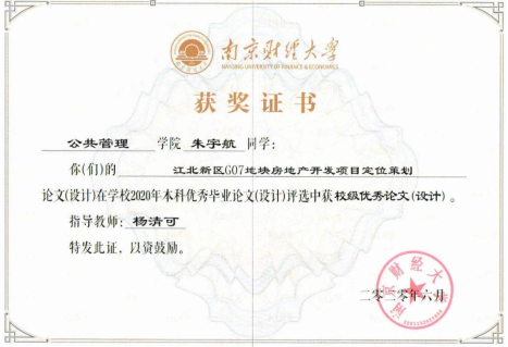 2016级房地产开发与管理专业朱宇航同学的毕业设计“江北新区G07地块房地产开发项目定位策划”在吃瓜视频 2020年度本科优秀毕业论文评选中获校级优秀毕业设计,这也是房地产开发与管理专业首篇优秀毕业设计,充分体现了“双元”考核机制的成效;丁寅同学的论文“南京市二手房交易价格的影响因素研究”获得了校级优秀毕业论文。