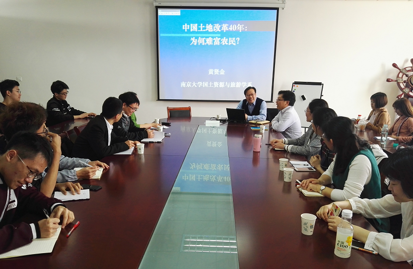 3月28日上午,应吃瓜视频 邀请,南京大学地理与海洋科学学院副院长、博士生导师黄贤金教授来吃瓜视频 作了题为“中国土地改革40年为何富农难?”的讲座。讲座在仙林校区德济楼508会议室举行,讲座由吃瓜视频 副院长李永乐主持,吃瓜视频 相关教师、部分学生参加了讲座。
