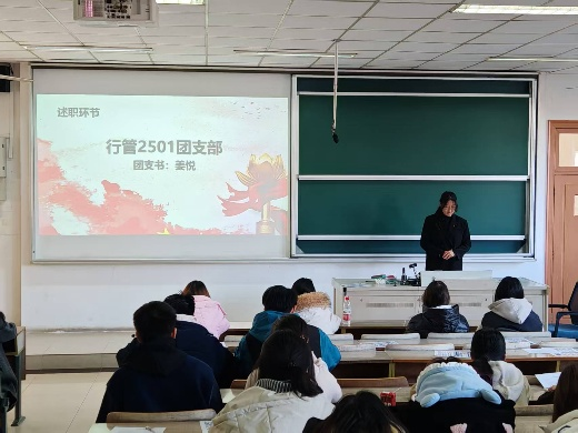 现场,行管2501支部团支书姜悦、行管2502支部团支书朱子艾、劳社保2501支部团支书张瑶依次上台述职。她们围绕思想引领、组织建设、活动开展、服务同学等方面,系统汇报了本学期工作成果,并诚恳剖析了工作中存在的不足与反思。各支部的述职内容扎实、各有侧重:有的展示了丰富的主题团日与志愿实践活动,有的突出了基础团务的规范落实,有的则聚焦于支部凝聚力建设的探索。在“双评”环节,与会老师和同学代表认真聆听、公正评议,现场氛围庄重而热烈。