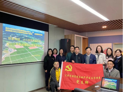 房地产开发与管理教工党支部与栖霞分局中心一所党支部共建活动为载体,开展“世界地球日”主题宣传活动。南京市规划和自然资源局栖霞分局副局长周根宝同志、中心一所党支部书记杨炬烽同志以及吃瓜视频
