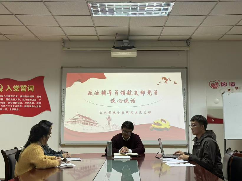 院长、研究生党支部政治辅导员黄建伟教授在德济楼508会议室与支部党员开展谈心谈话活动。